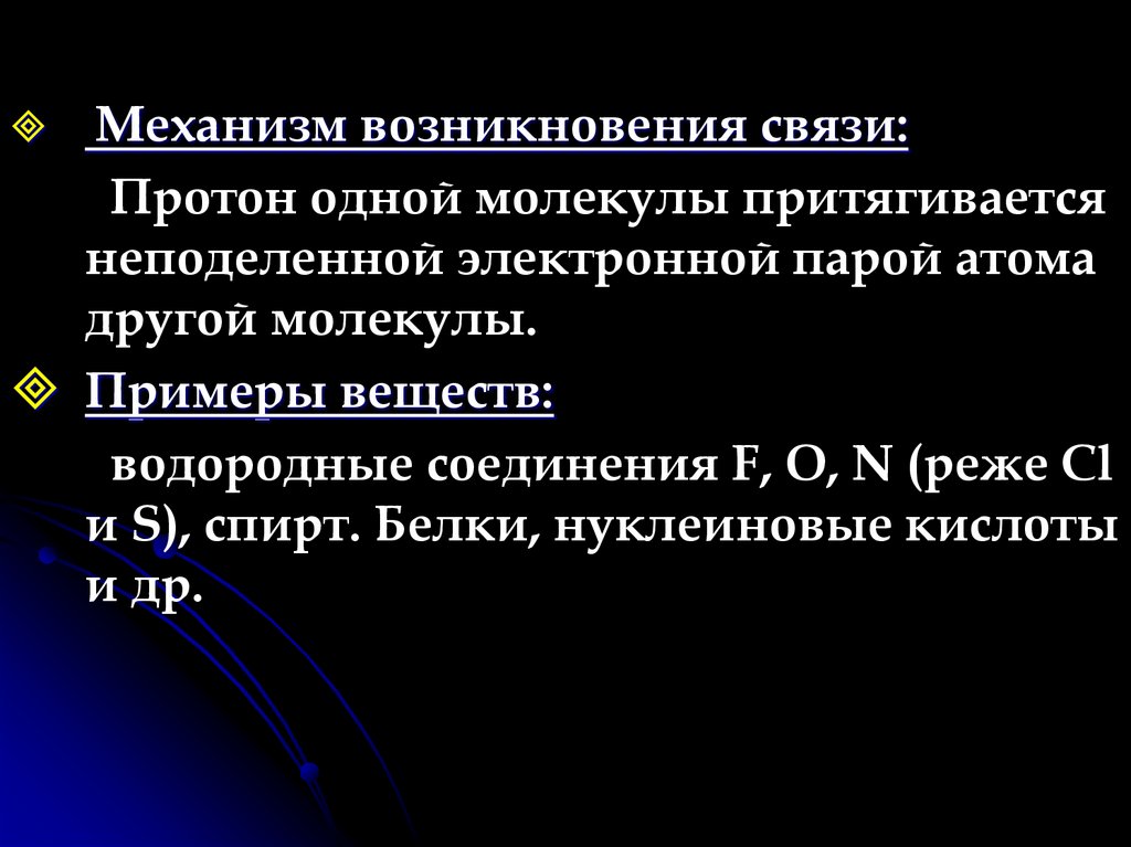Механизм возникновения связи:Протон одной молекулы притягивается