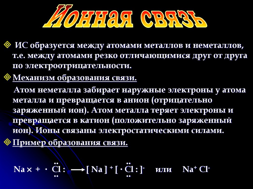 ИС образуется между атомами металлов и неметаллов,т.е. между атомами резко отличающимися друг от друга