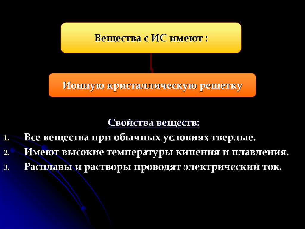 Вещества с ИС имеют :Ионную кристаллическую решетку