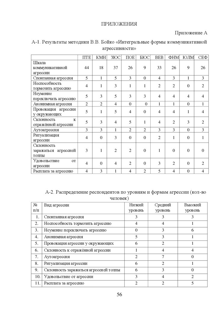 А-2. Распределение респондентов по уровням и формам агрессии (кол-во