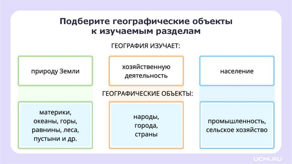 Подберите географические объектык изучаемым разделам