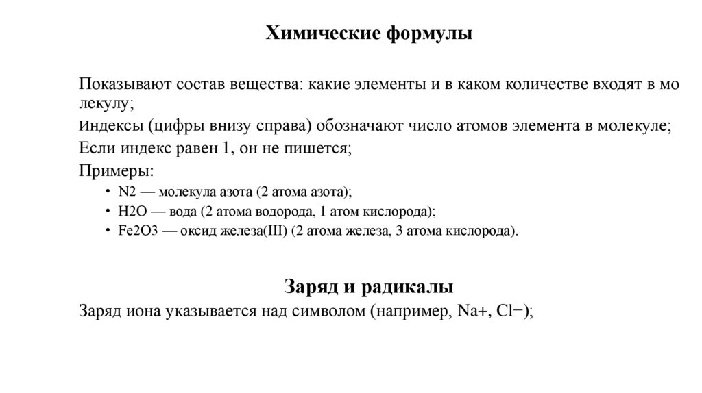 Химические формулыПоказывают состав вещества: какие элементы и в каком количестве входят в мо