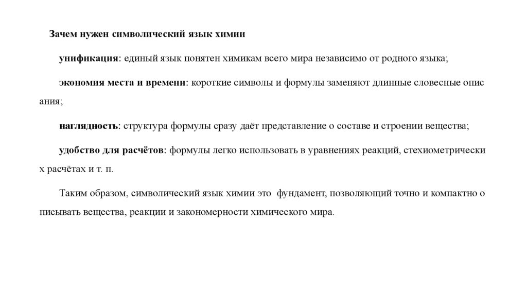 Таким образом, символический язык химии это фундамент, позволяющий точно и компактно о