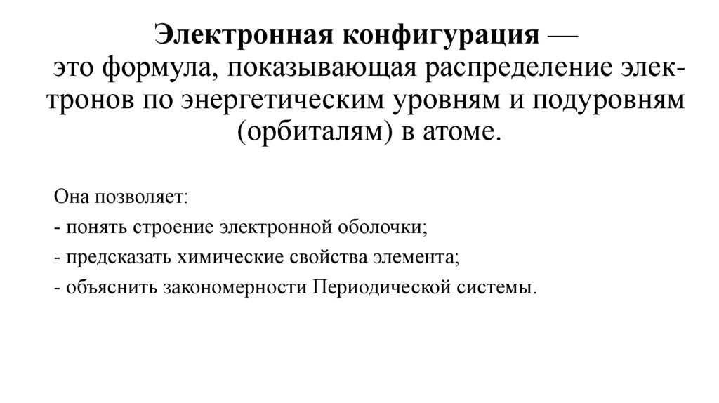 Электронная конфигурация —это формула, показывающая распределение электронов по энергетическим уровням и подуровням