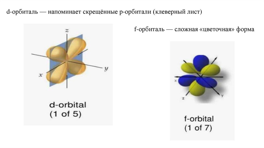 d-орбиталь — напоминает скрещённые p-орбитали (клеверный лист)f-орбиталь — сложная «цветочная» форма