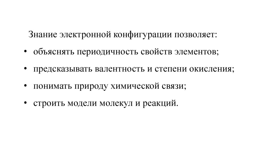 Знание электронной конфигурации позволяет:• объяснять периодичность свойств элементов;