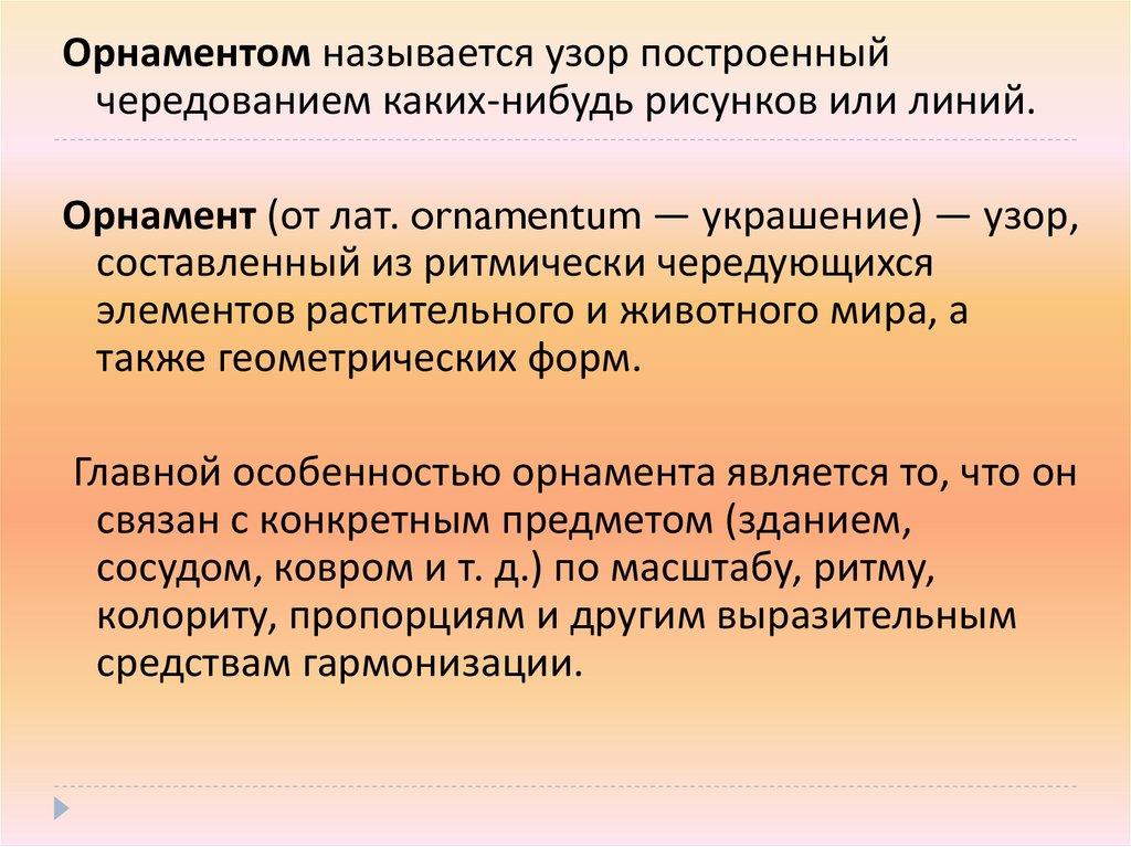 Орнаментом называется узор построенныйчередованием каких-нибудь рисунков или линий.