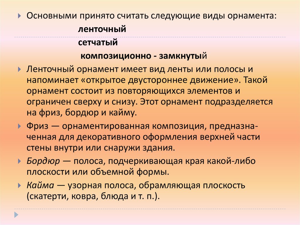 Основными принято считать следующие виды орнамента:ленточный