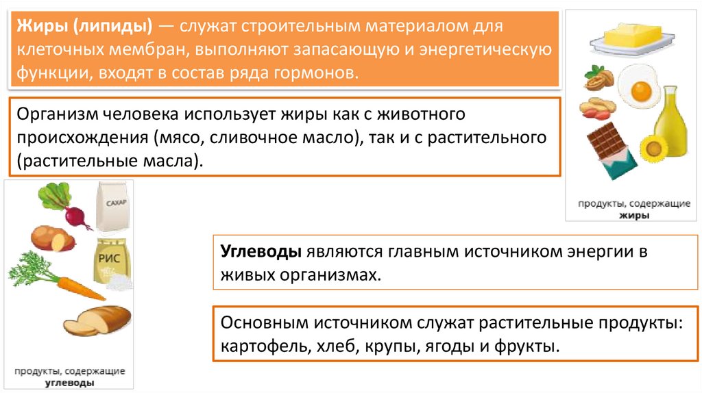 Жиры (липиды) — служат строительным материалом дляклеточных мембран, выполняют запасающую и энергетическую