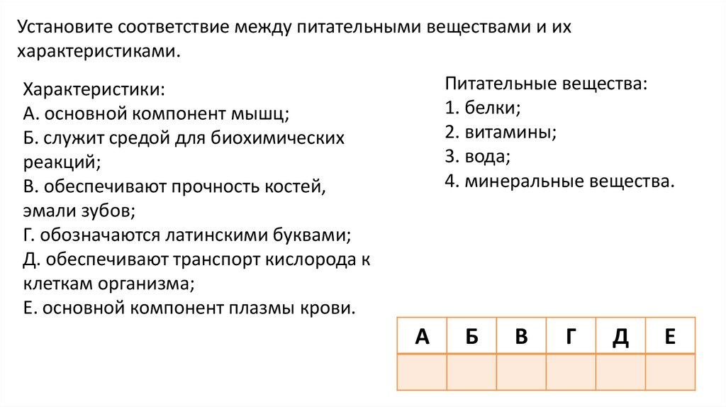 Установите соответствие между питательными веществами и иххарактеристиками.