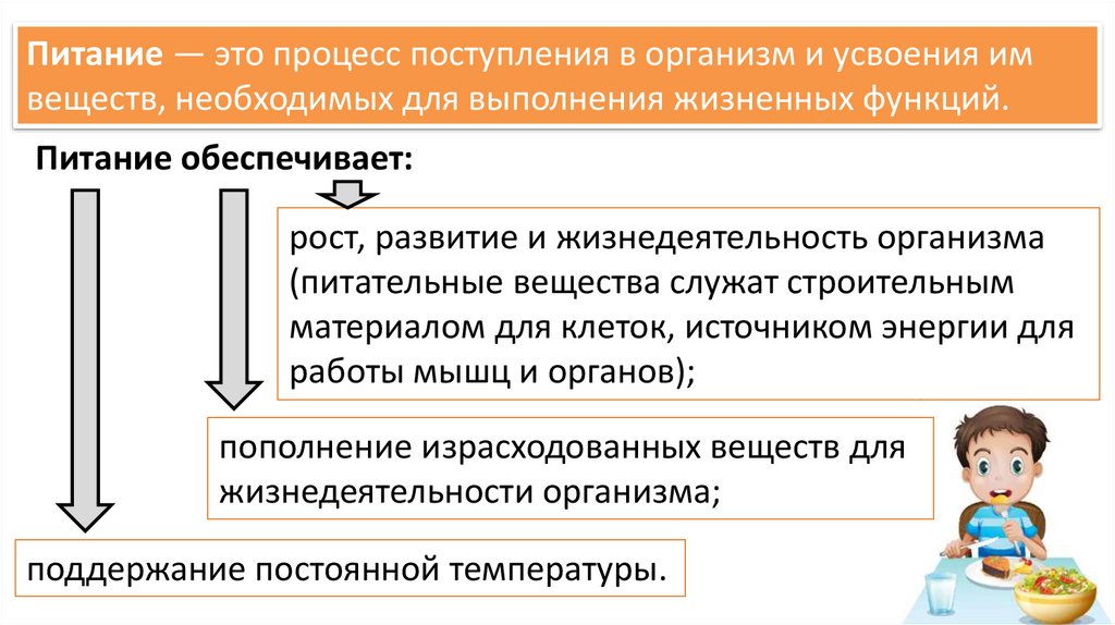 Питание — это процесс поступления в организм и усвоения имвеществ, необходимых для выполнения жизненных функций.