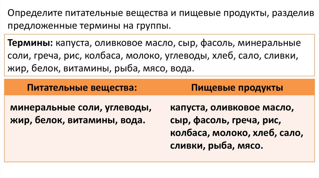 Определите питательные вещества и пищевые продукты, разделивпредложенные термины на группы.