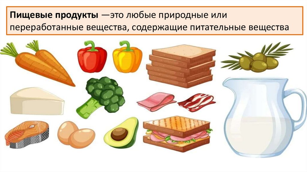 Пищевые продукты —это любые природные илипереработанные вещества, содержащие питательные вещества