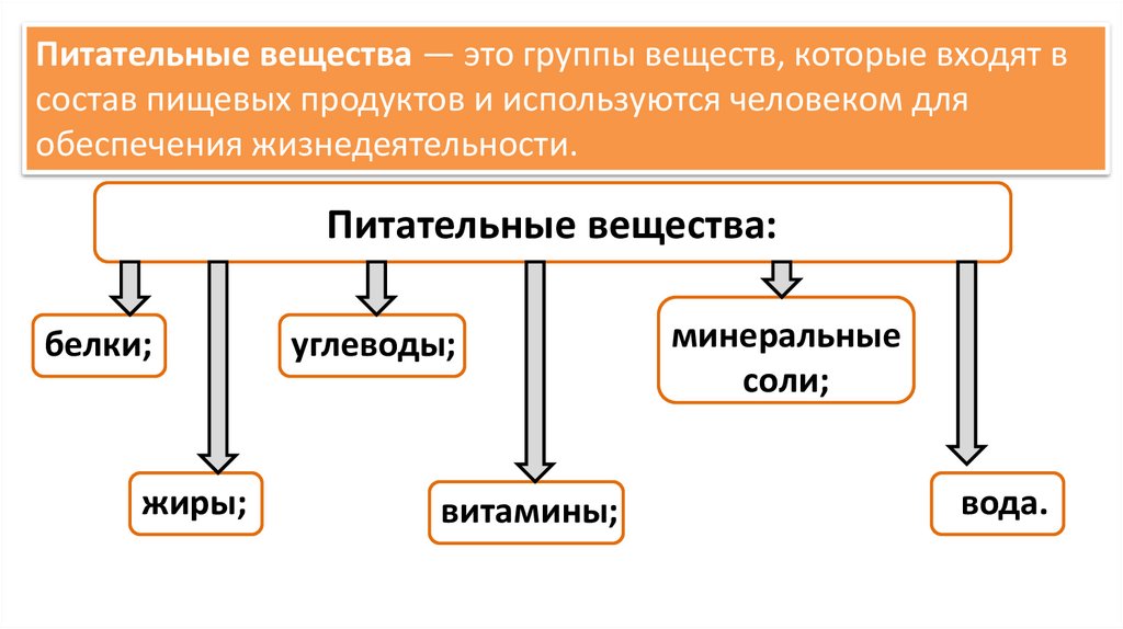 Питательные вещества — это группы веществ, которые входят всостав пищевых продуктов и используются человеком для