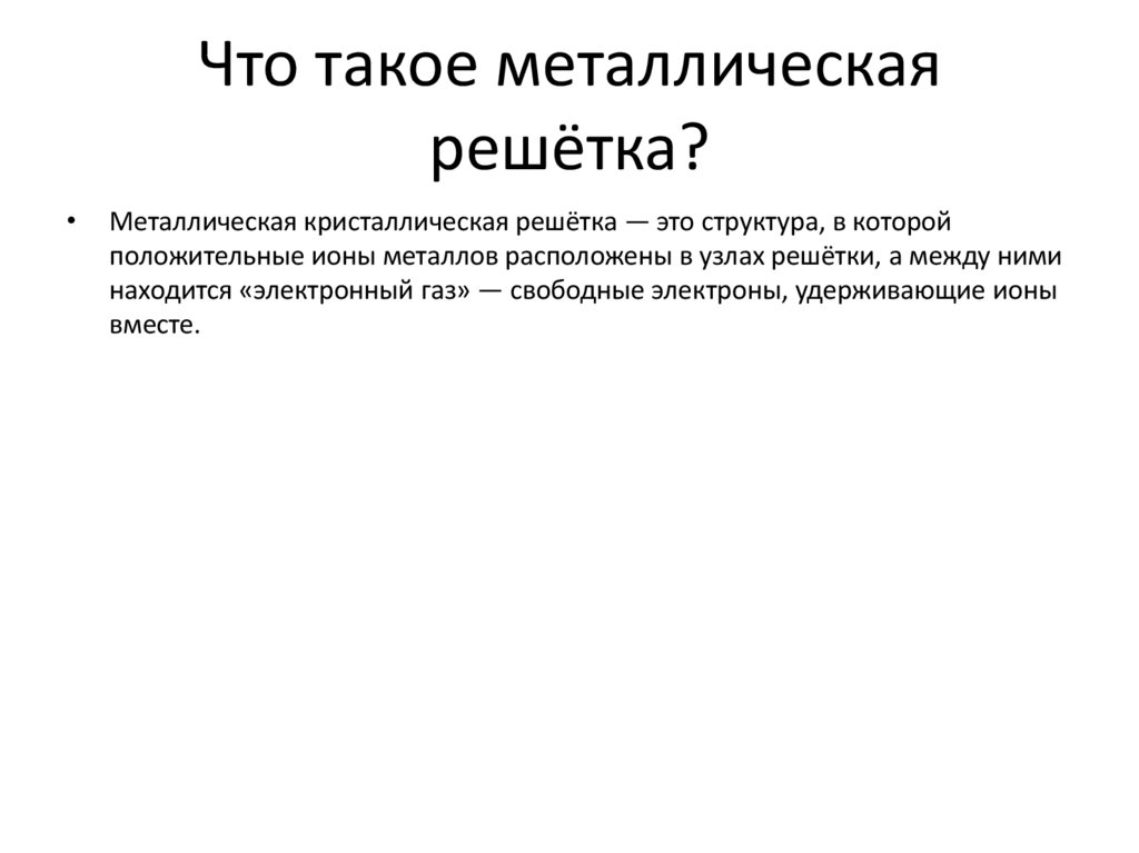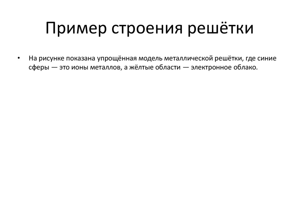 Пример строения решёткиНа рисунке показана упрощённая модель металлической решётки, где синие