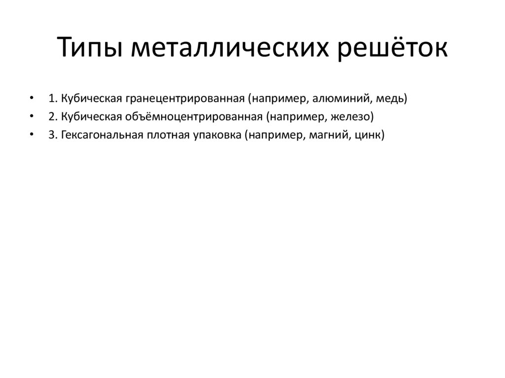Типы металлических решёток1. Кубическая гранецентрированная (например, алюминий, медь)