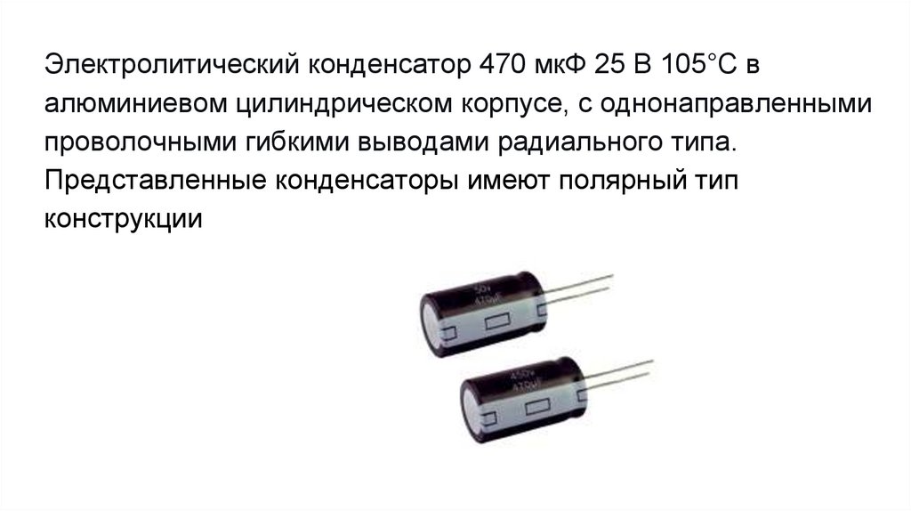 Электролитический конденсатор 470 мкФ 25 В 105°С валюминиевом цилиндрическом корпусе, с однонаправленными