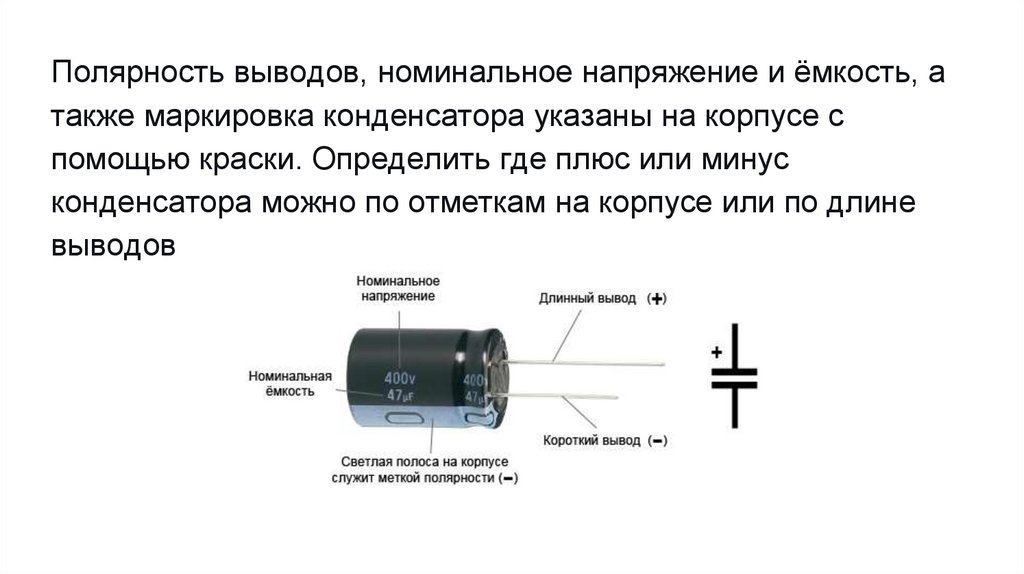 Полярность выводов, номинальное напряжение и ёмкость, атакже маркировка конденсатора указаны на корпусе с