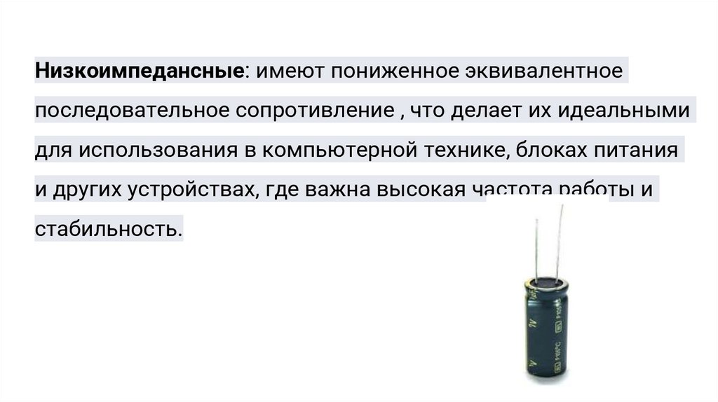 Низкоимпедансные: имеют пониженное эквивалентноепоследовательное сопротивление , что делает их идеальными