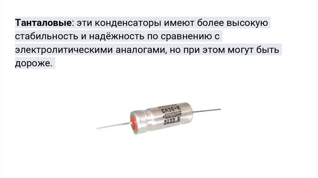 Танталовые: эти конденсаторы имеют более высокуюстабильность и надёжность по сравнению с