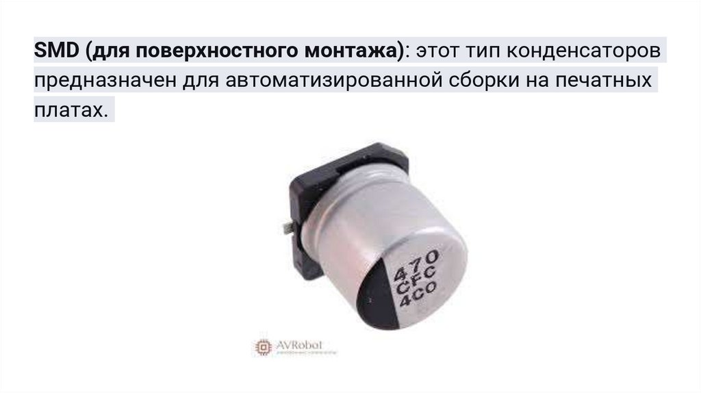 SMD (для поверхностного монтажа): этот тип конденсаторовпредназначен для автоматизированной сборки на печатных