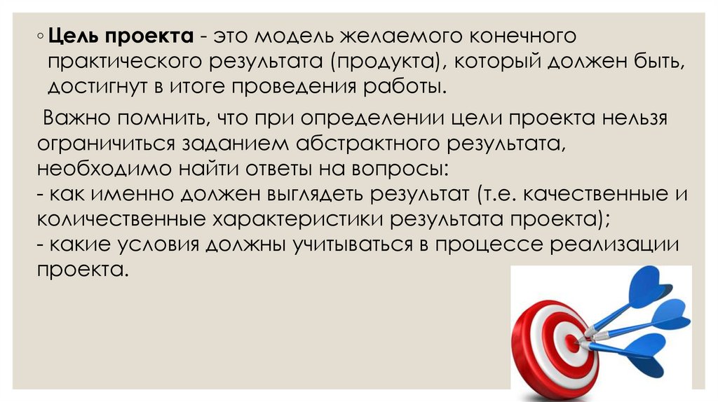 ◦ Цель проекта - это модель желаемого конечногопрактического результата (продукта), который должен быть,