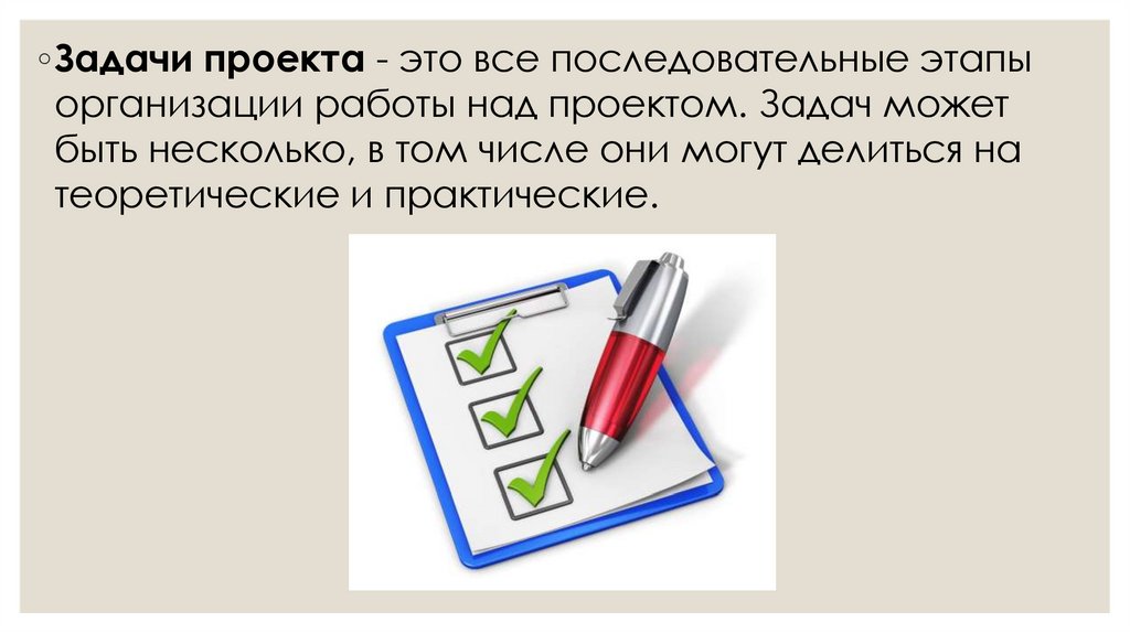 ◦Задачи проекта - это все последовательные этапыорганизации работы над проектом. Задач может