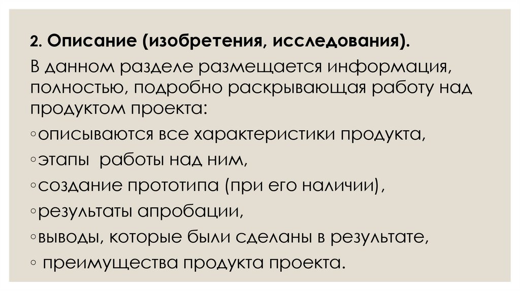 2. Описание (изобретения, исследования).В данном разделе размещается информация,