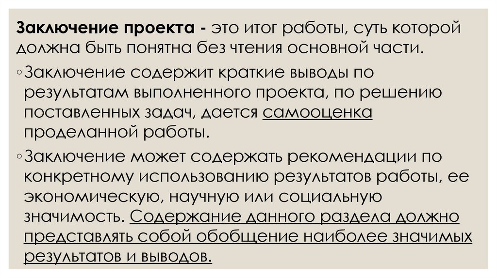 Заключение проекта - это итог работы, суть которойдолжна быть понятна без чтения основной части.