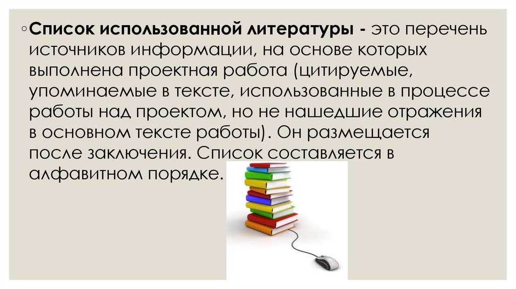 ◦Список использованной литературы - это переченьисточников информации, на основе которых