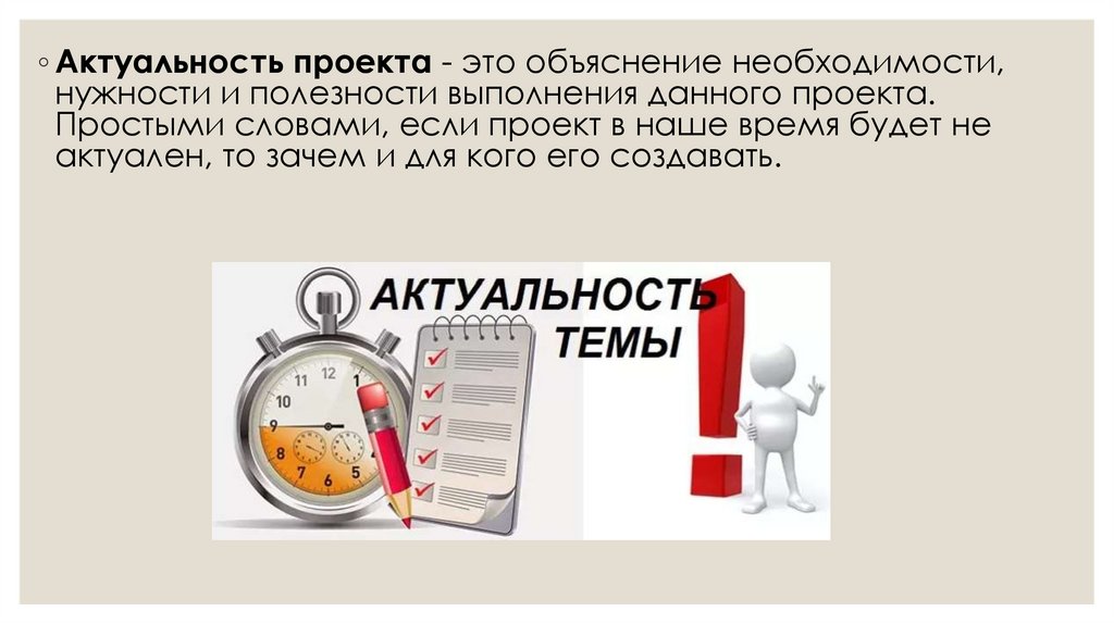 ◦ Актуальность проекта - это объяснение необходимости,нужности и полезности выполнения данного проекта.