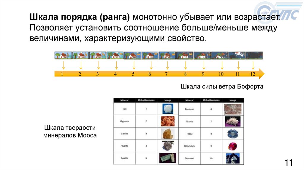 Шкала порядка (ранга) монотонно убывает или возрастает.Позволяет установить соотношение больше/меньше между