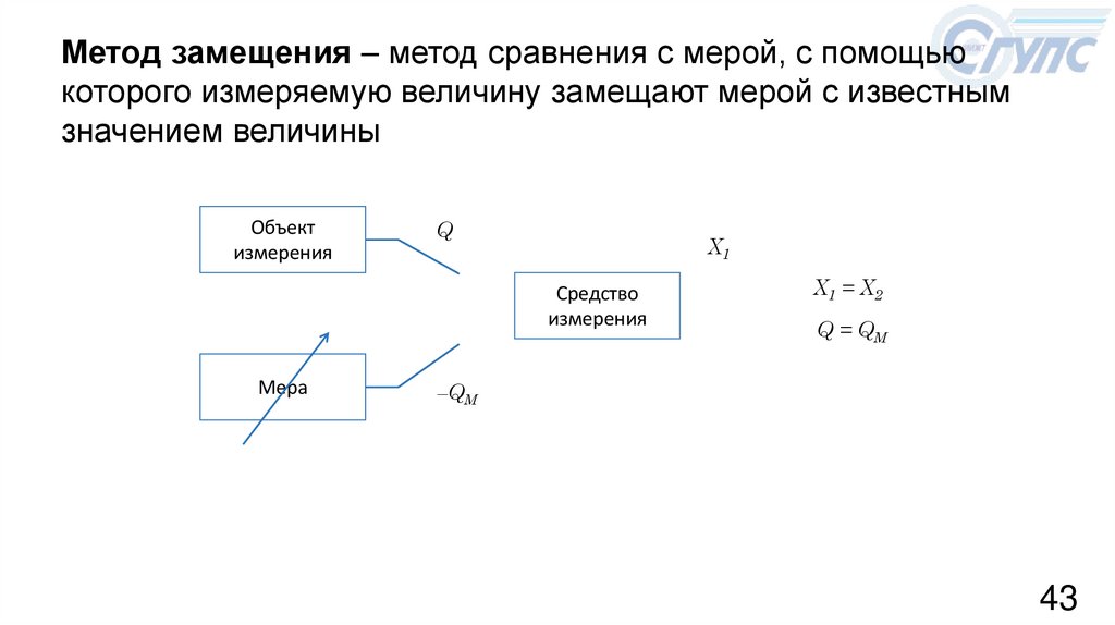 Метод замещения – метод сравнения с мерой, с помощьюкоторого измеряемую величину замещают мерой с известным