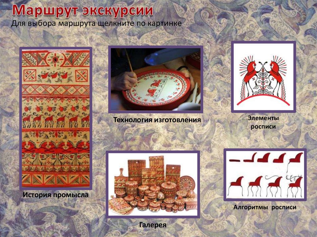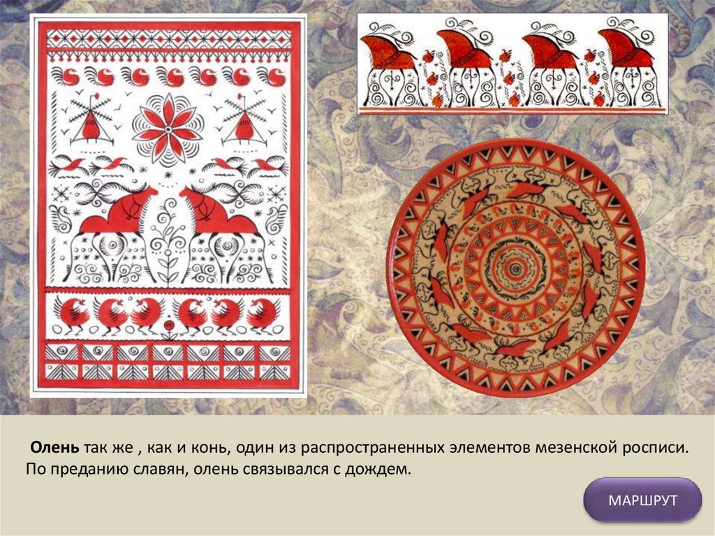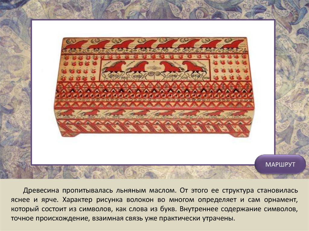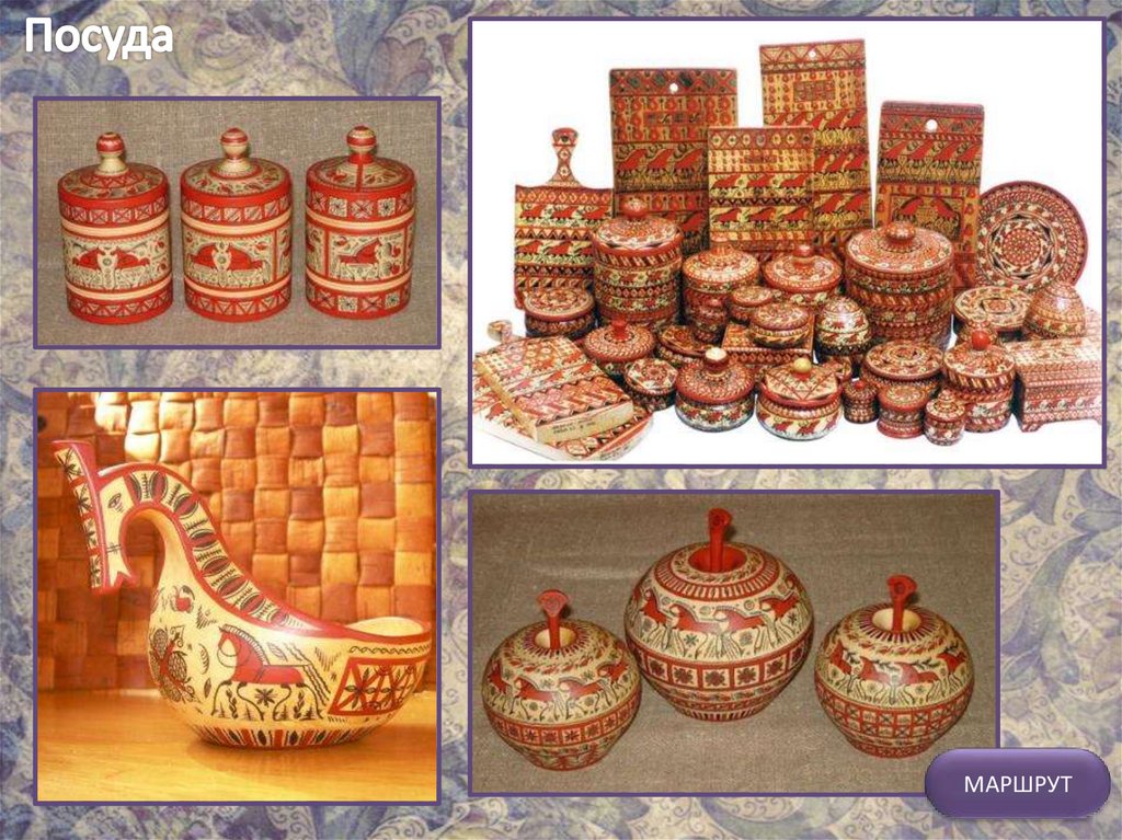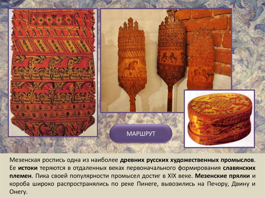 МАРШРУТМезенская роспись одна из наиболее древних русских художественных промыслов.