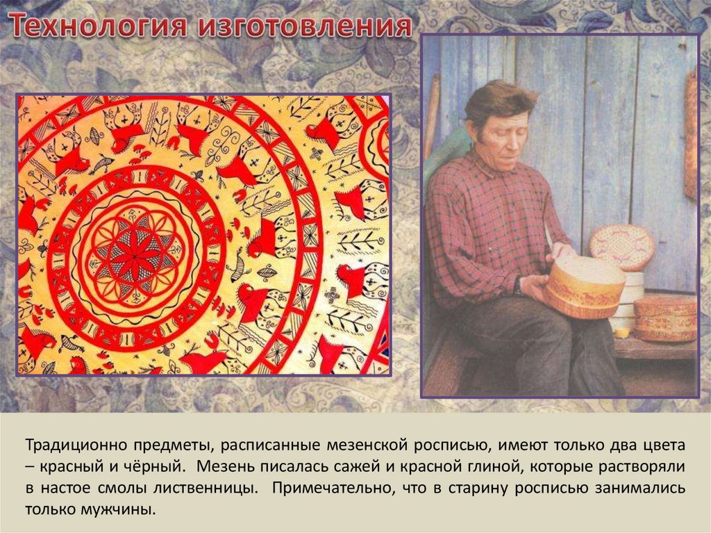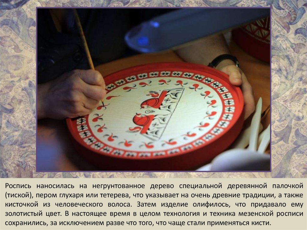 золотистый цвет. В настоящее время в целом технология и техника мезенской росписи