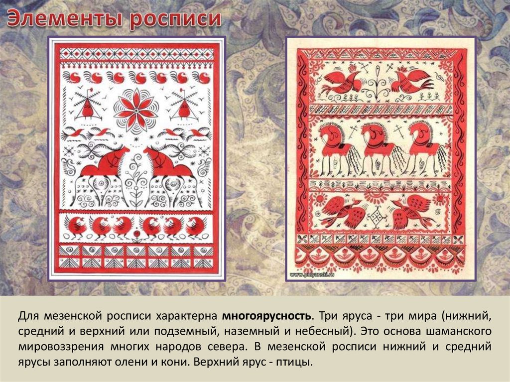Для мезенской росписи характерна многоярусность. Три яруса - три мира (нижний,средний и верхний или подземный, наземный и небесный). Это основа шаманского