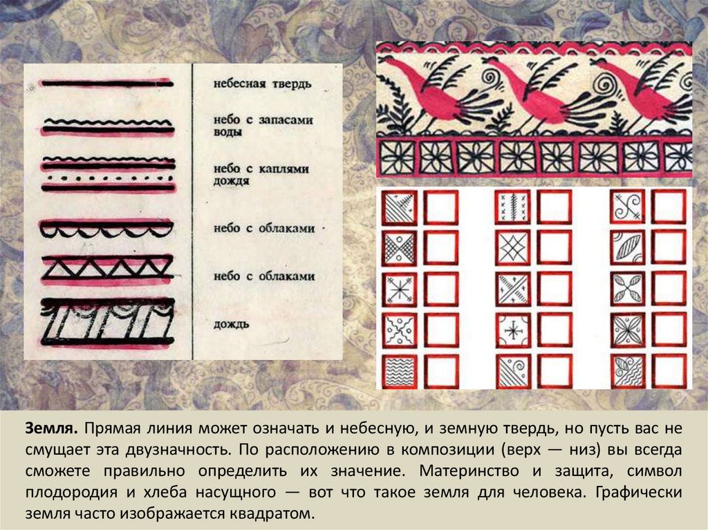 Земля. Прямая линия может означать и небесную, и земную твердь, но пусть вас несмущает эта двузначность. По расположению в композиции (верх — низ) вы всегда