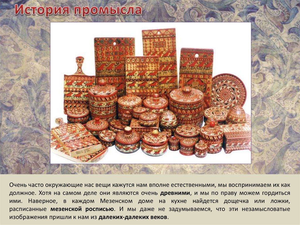расписанные мезенской росписью. И мы даже не задумываемся, что эти незамысловатые