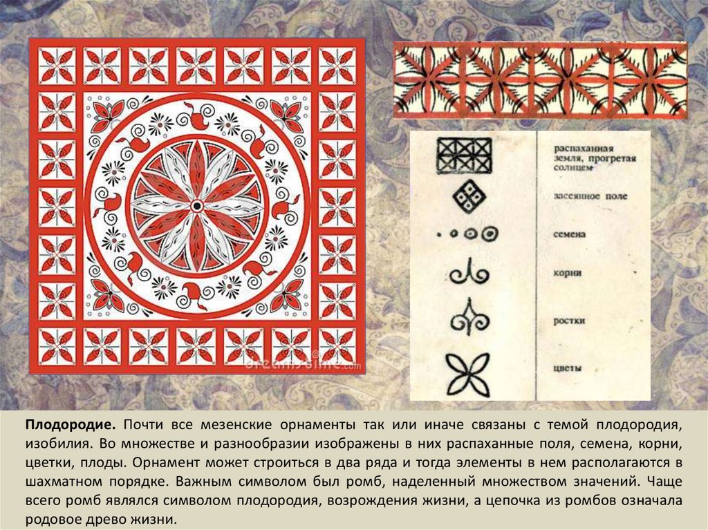 Плодородие. Почти все мезенские орнаменты так или иначе связаны с темой плодородия,изобилия. Во множестве и разнообразии изображены в них распаханные поля, семена, корни,