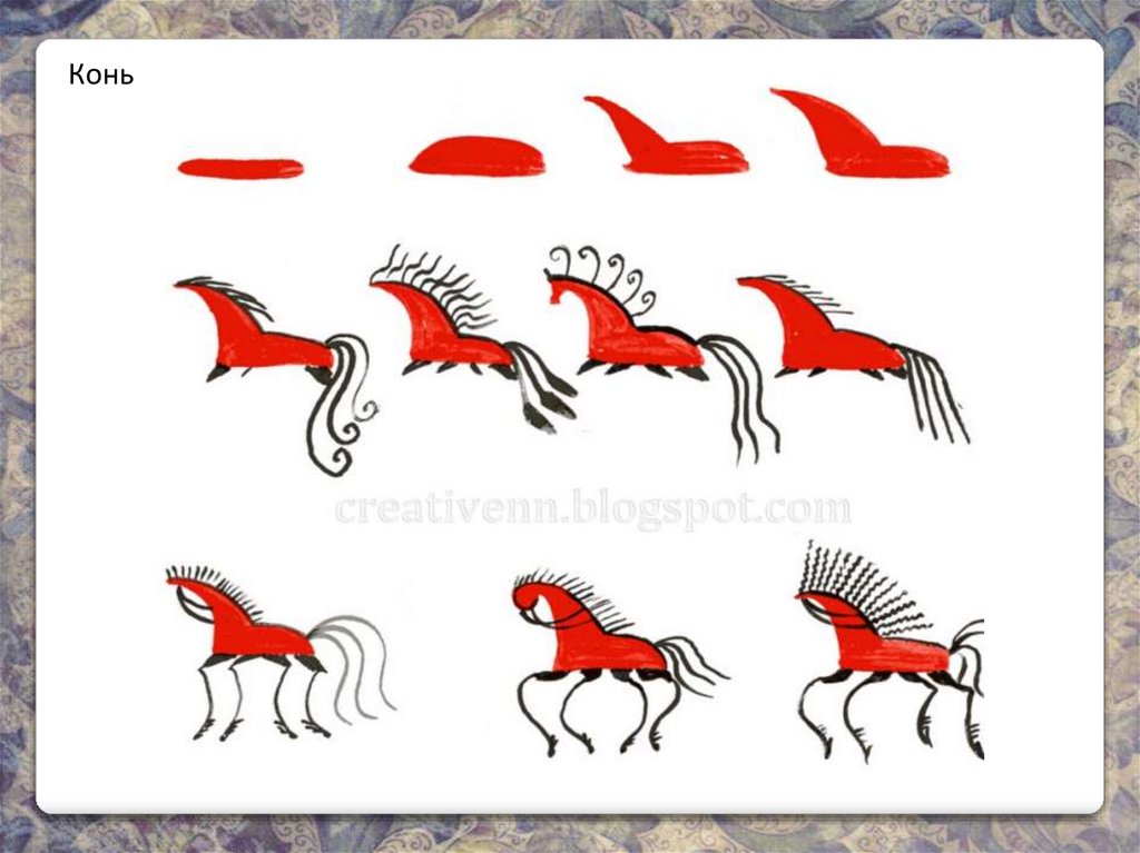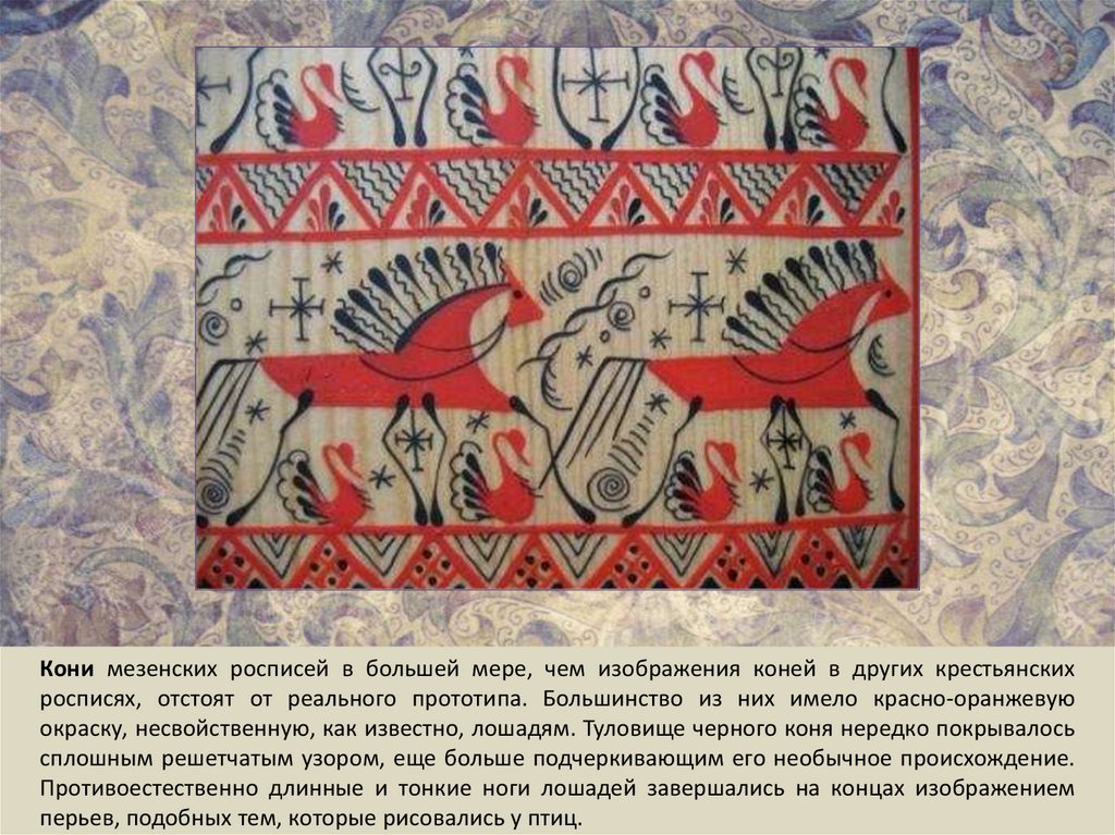 Кони мезенских росписей в большей мере, чем изображения коней в других крестьянскихросписях, отстоят от реального прототипа. Большинство из них имело красно-оранжевую