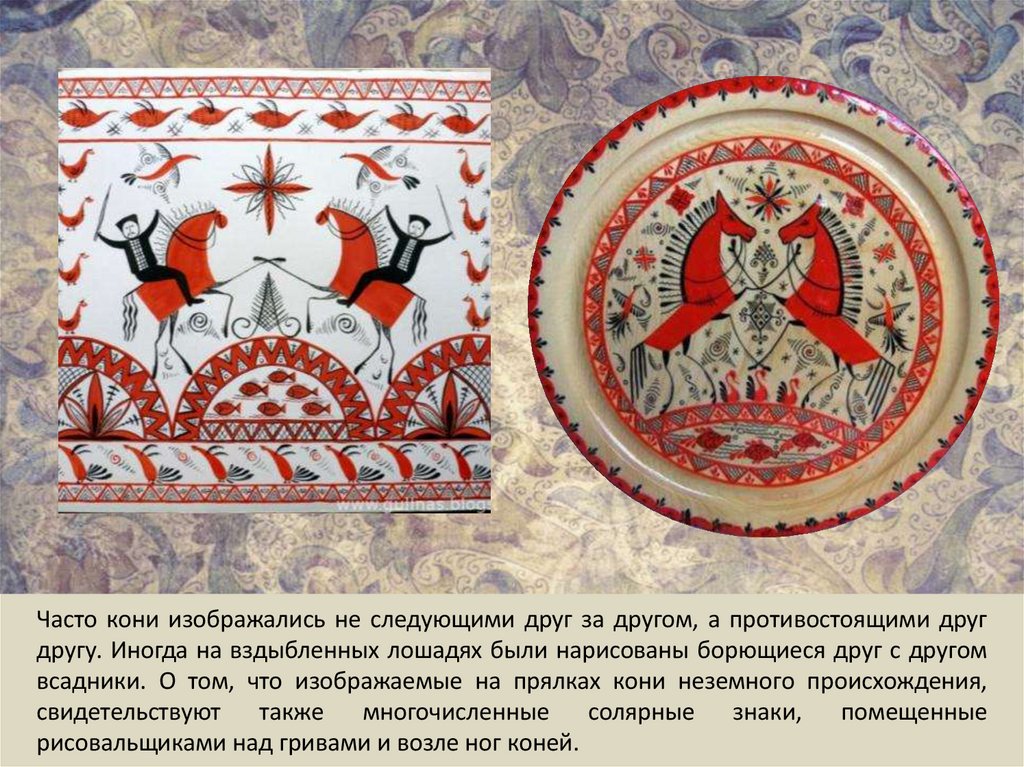 Часто кони изображались не следующими друг за другом, а противостоящими другдругу. Иногда на вздыбленных лошадях были нарисованы борющиеся друг с другом