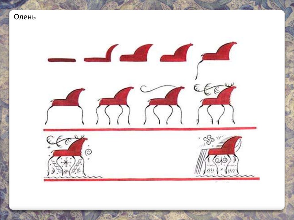 Олень так же , как и конь, один из распространенных элементов мезенской росписи.По преданию славян, олень связывался с дождем.