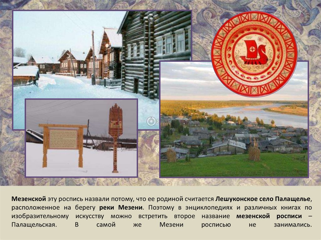 Мезенской эту роспись назвали потому, что ее родиной считается Лешуконское село Палащелье,расположенное на берегу реки Мезени. Поэтому в энциклопедиях и различных книгах по