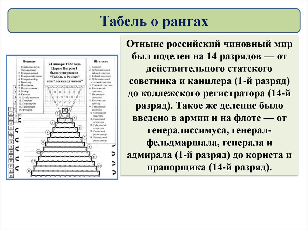 Табель о рангах — законодательный акт Петра I (1722), определявший