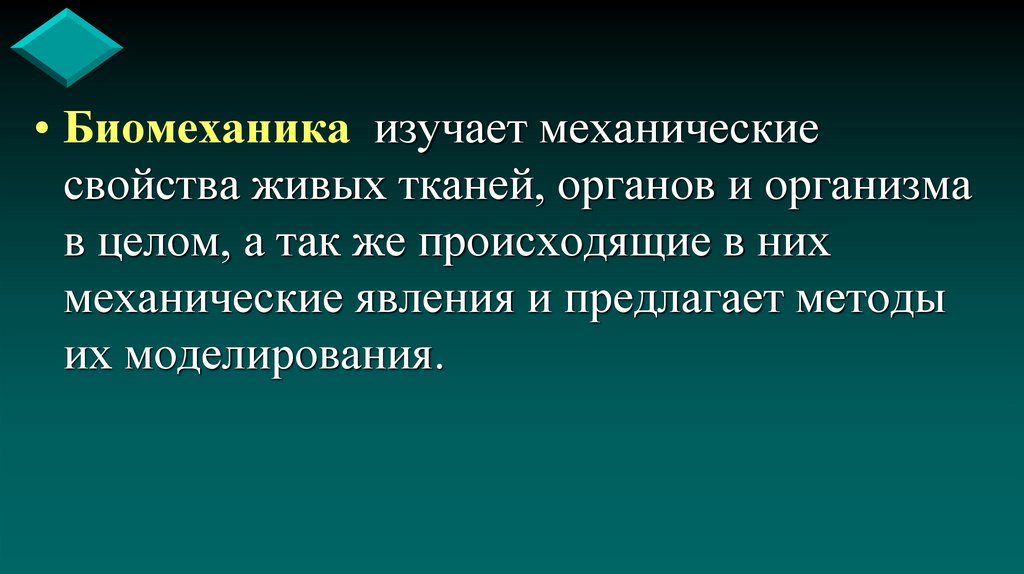 • Биомеханика изучает механическиесвойства живых тканей, органов и организма