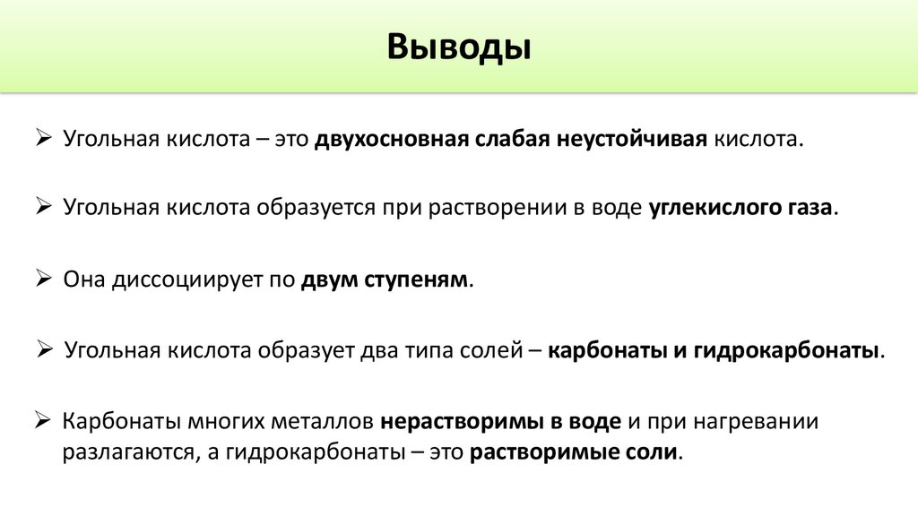 Выводы➢ Угольная кислота – это двухосновная слабая неустойчивая кислота.