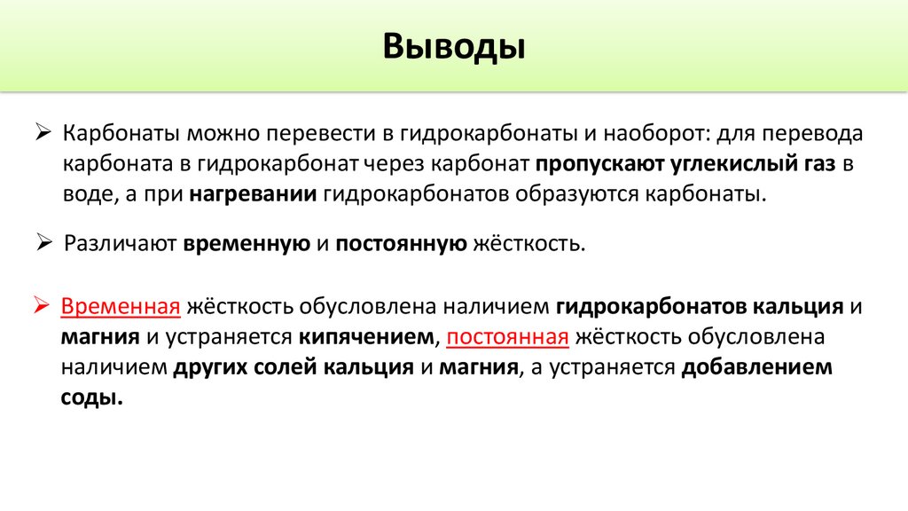 Выводы➢ Карбонаты можно перевести в гидрокарбонаты и наоборот: для перевода
