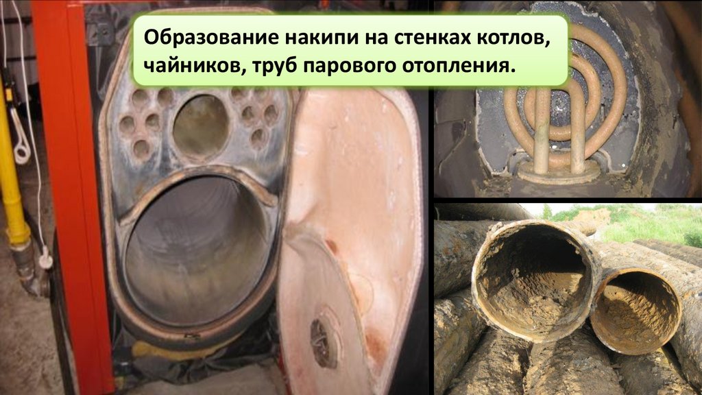 Образование накипи на стенках котлов,чайников, труб парового отопления.