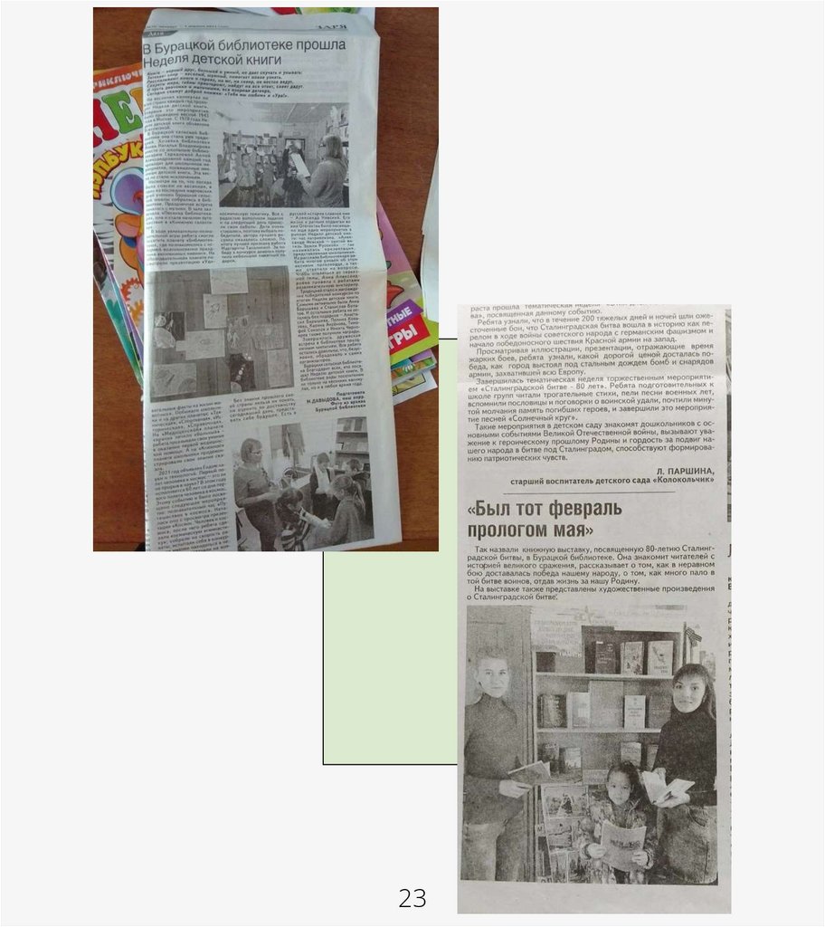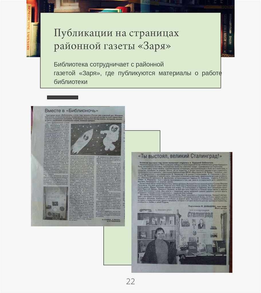 Библиотека сотрудничает с районнойгазетой «Заря», где публикуются материалы о работе