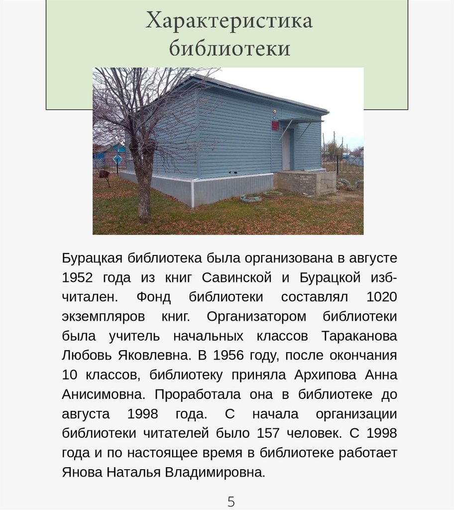 Бурацкая библиотека была организована в августе1952 года из книг Савинской и Бурацкой избчитален. Фонд библиотеки составлял 1020
